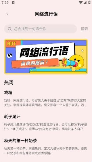 还将各种热门话题实时推荐,用户可以随时在线查看各种热门话题的网络流行语学习。