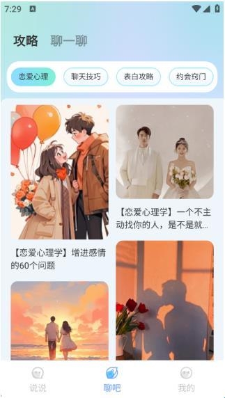 4、在聊吧页面中可以知晓恋爱心理、聊天技巧、表白攻略以及约会窍门等版块。