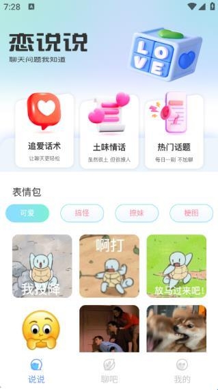 1、在说说页面中有追爱话术、土味情话、热门话题版块,还有各种表情包;