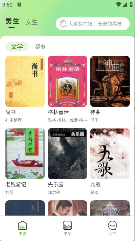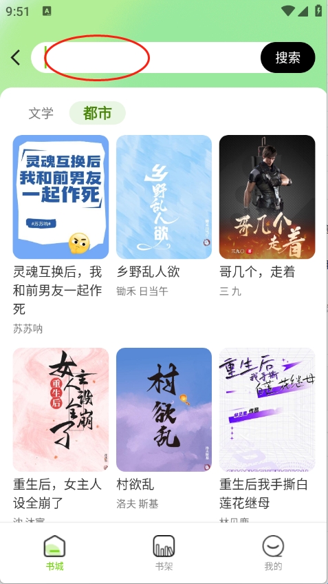 2、“书城”页面包含了很多的小说资源类型,文学以及都市都有。