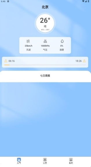 进入天气页面,展示了今日温度、风速、气压等数据,非常详细。