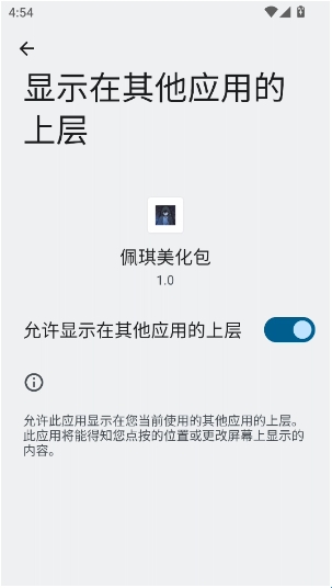 安装完成后根据提示开启“显示在其他应用的上层”权限。
