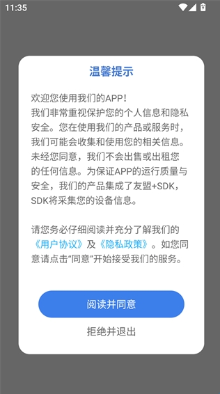 下载安装软件并打开,点击阅读并同意,进入软件主界面;