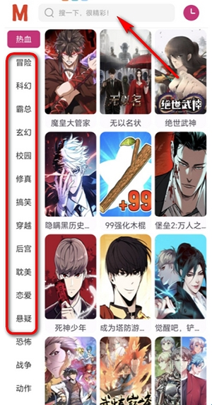 1、可以直接在搜索框中输入关键词找漫画,或者左侧根据分类找漫画。