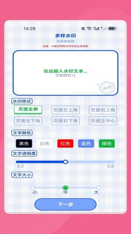 可自定义输入水印内容,同时可以自定义设置水印的样式、大小和颜色等参数。