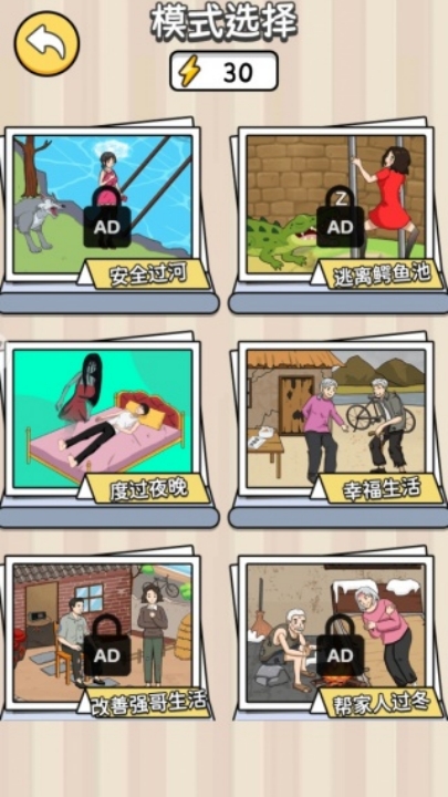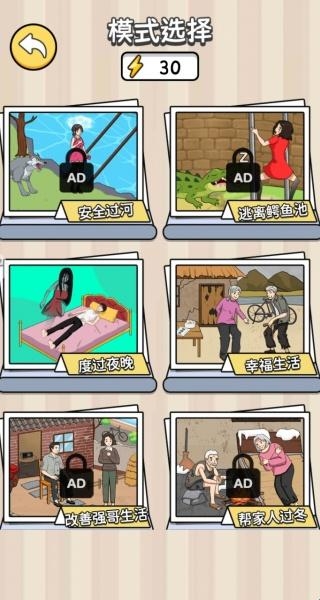 2、游戏包含多种模式,如安全过河、逃离鳄鱼池、度过夜晚、幸福生活和帮家人过冬等,你可以选择自己喜欢的模式开始游戏。