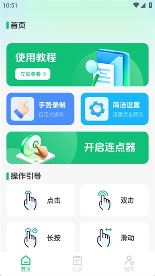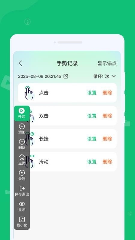 自动任务连点完成器app是一款非常好用的连点器辅助工具软件,这款软件可以自定义手势设置和手势循环次数,支持点击、双击、长按、滑动等多种手势操作,满足用户多样化的使用需求。此外,软件内还有详细的使用教程和操作说明,让用户可以更轻松快速地上手使用,界面简洁,操作方便,有需要的朋友们快来下载体验吧。
