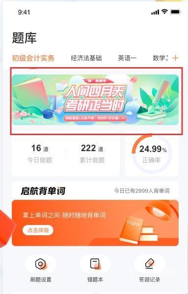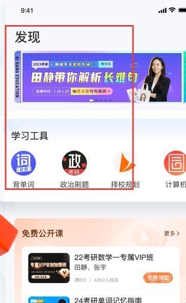3、含课程banner与学习工具,如背单词、政治刷题等,提供考研学习资源。