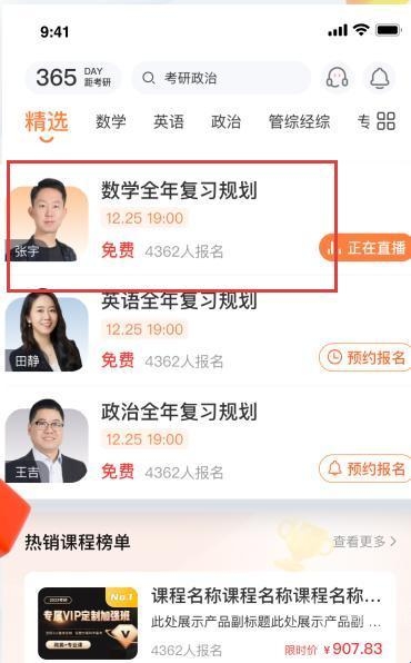 1、考研课程,有数学全年复习规划直播,含时间、报名人数,可点击进入学习。