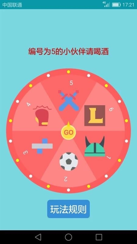 幸运转盘,玩法简单,点击按钮转动转盘,停在哪个位置就哪个小伙伴喝酒;