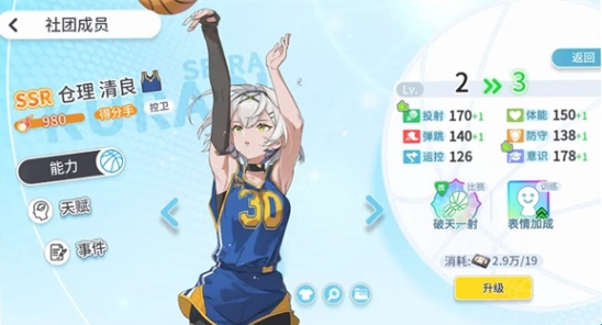 3、在训练过程中每一位球员都有不同的推荐属性,比如澪奈推荐弹跳和运控,则在训练的过程中可更为侧重地提高这两个能力。这样各项能力会更有效率地转化为战斗力。训练项目中有小人标志说明本日选择此项目可与队友训练,可给予更高的属性。