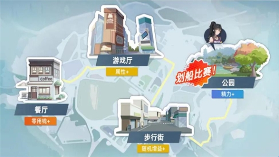4、在周末的时候玩家可以合理选择出行方式来强化团队。扭蛋:花费零用钱可选择一种属性效果强化自身与团队;小游戏:花费零用钱选择一个属性并通过投篮小游戏获得分数提升属性;餐厅:消耗精力在餐厅获得零用钱;公园:通过划船等各种玩法可获得精力与属性。