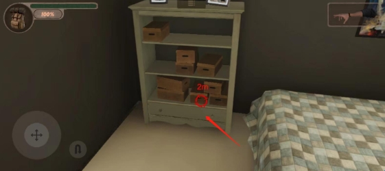 7、打开旁边房间的门,先在柜子上找到一个笔记,然后走到另外那边,点击下图这个抽屉;