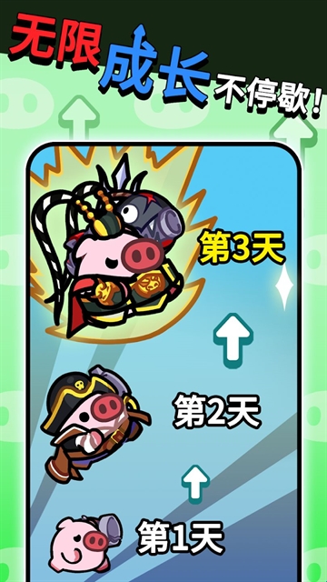 2、通过战斗获取资源,用于升级装备、强化技能和进化猪猪伙伴,不断提升整体战力。