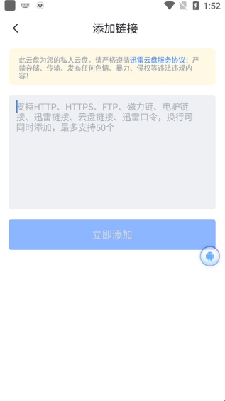 支持http、https、ftp、磁力链、电驴链接,迅雷链接、云盘链接、迅雷口令,换行可同时添加,最多支持50个下载地址;