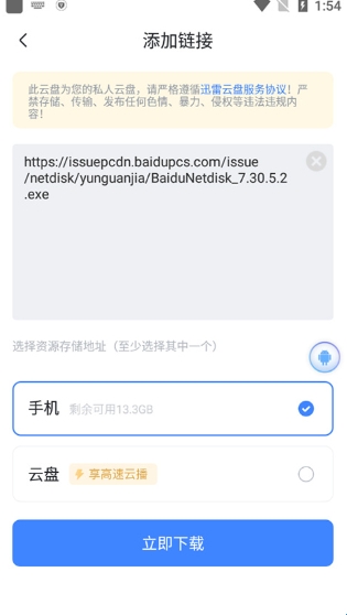 选择资源存储地址,支持下载到手机上,也可以下载到迅雷云盘上;