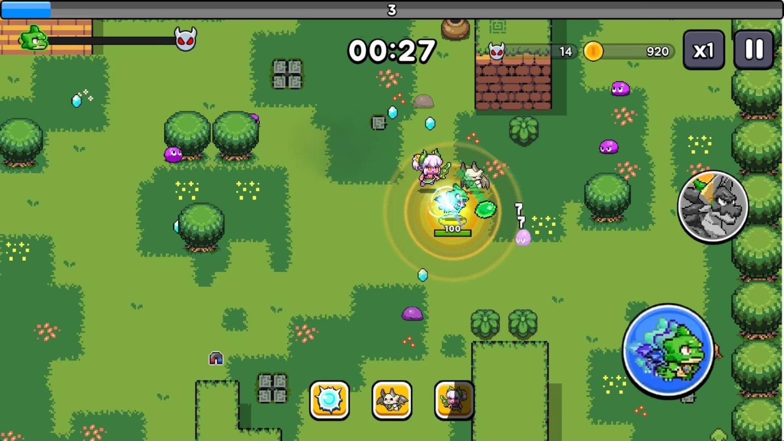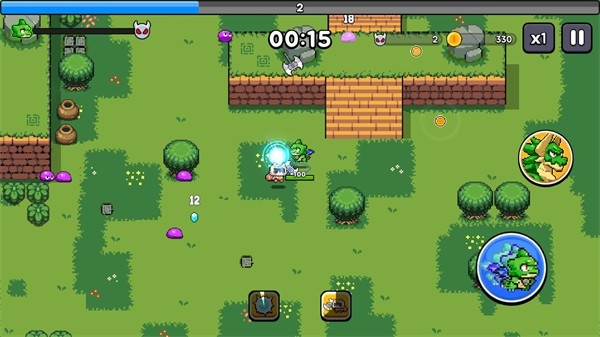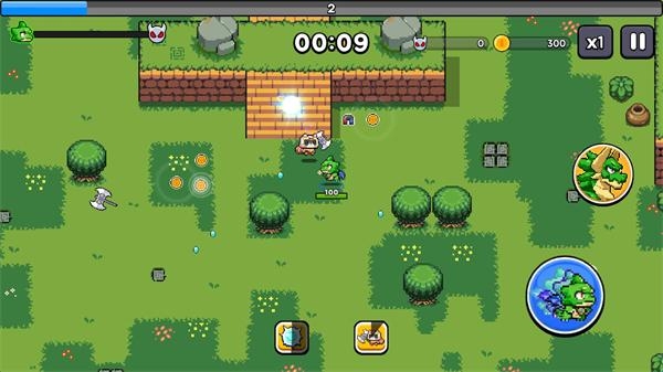 3、在关卡里小龙会自动攻击出现的怪物,击败敌人可以拾取经验宝石提升等级,升级后可以选择一项能力来强化自己。