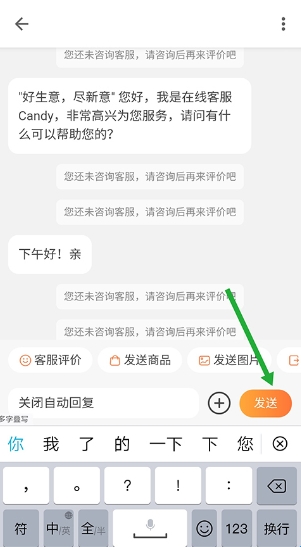 2、在打开的页面中输入“关闭自动回复”后点击【发送】