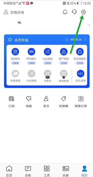 1、打开并登录阿里卖家,即阿里卖家App,进入【我的】页面中点击右上角的设置图标(下图绿色箭头所指)