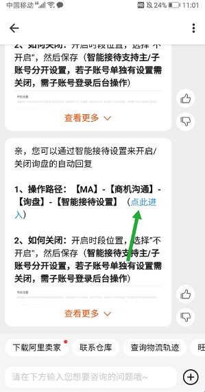 3、在客服回复的内容中点击蓝色文本链接【点此进入】