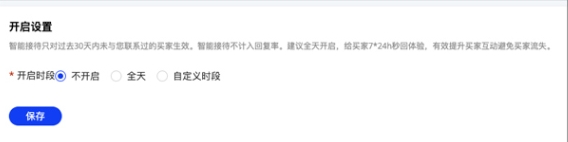 4、开启时段位置,选择”不开启“,然后保存即可(智能接待支持主/子账号分开设置,若子账号单独有设置需关闭,需子账号登录后台操作)