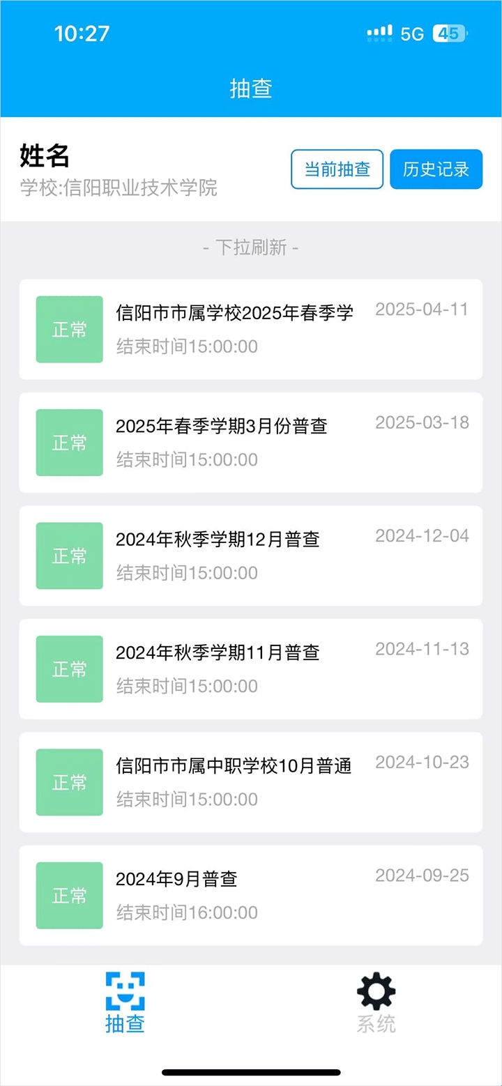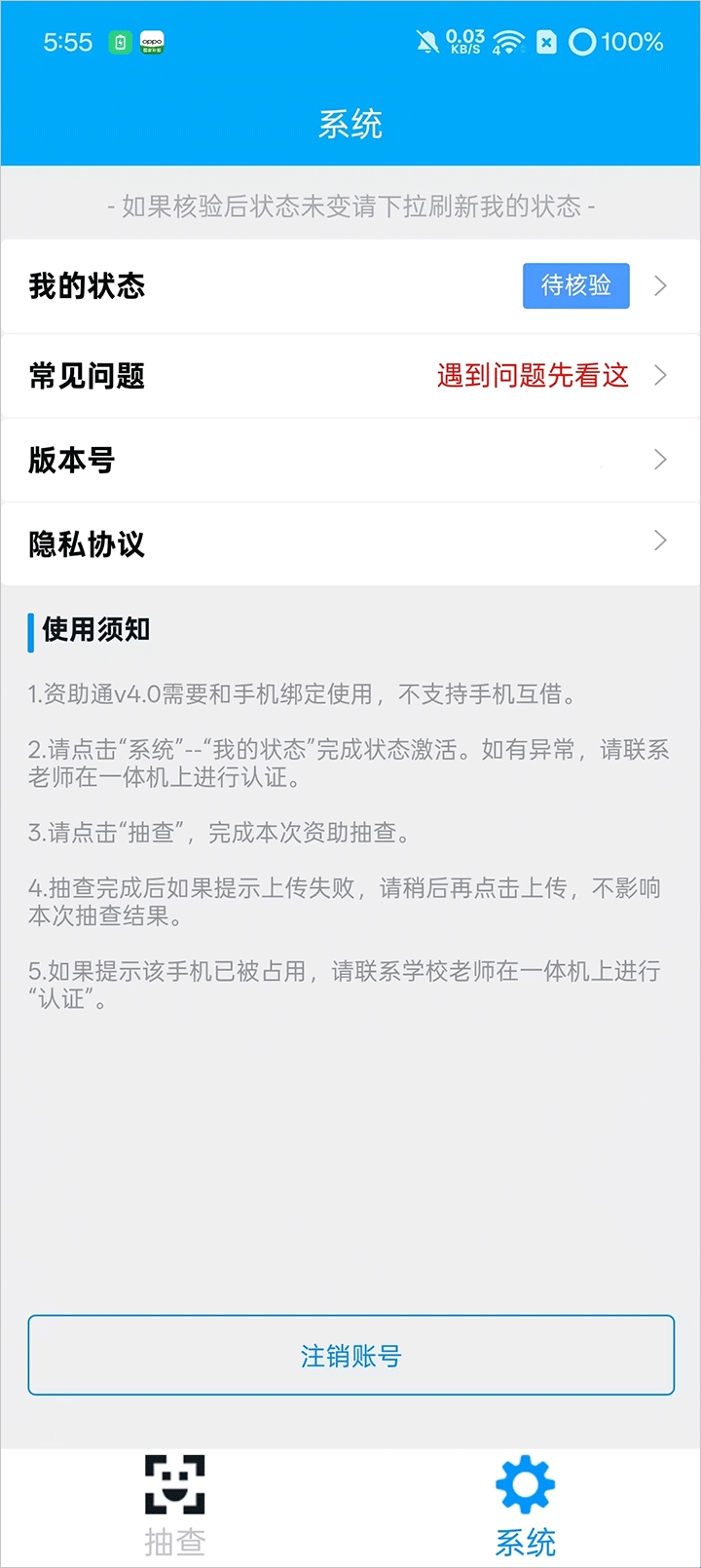 每月学校通知学生抽查点名时(不可使用他人手机),学生务必在校园范围内完成手机点名操作,在校外运行APP,则会被系统记录为不在校。请运行软件时,务必打开WIFI开关,点击左侧“抽查”按键,点击待识别(即蓝色图标),面对手机摄像头,根据语音提示做出相应动作,进行识别。正常识别后图标会变成绿色,显示“正常”,说明已完成本次点名。出现其他异常情况,请第一时间联系相应班主任、辅导员老师。如果抽查时间结束,学生未按时完成手机验证识别,系统会自动记录为“缺位”(即不在校),每学期两次及以上抽查均为缺位(或连续两个月请假),将不能正常享受本学期资助。