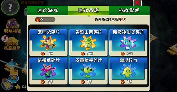 2、魔力之果:我选了海盗只有两条地面通路的一关,其中一路正常防,剩下那路坚果、高坚果轮着种,反正就是攒够11+僵尸种巴豆就行。