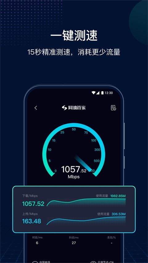 【一键测速】一键精准测试Wi-Fi、4G、5G和宽带速度,提供下载速度、上传速度、延时、丢包、抖动数据 ;