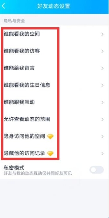 4、进入好友动态设置后,可以看到各种设置的访问权限,根据要求选择设置即可。