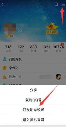 3、进入后点击右上角的三条横杠图标,选择好友动态设置。