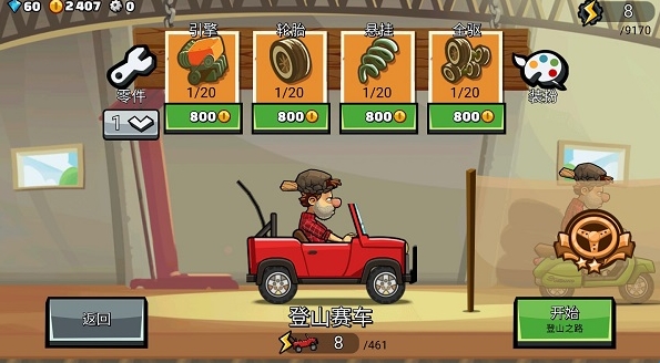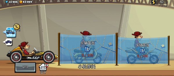 在部件系统里,可以对汽车增加一些新的部件,增加汽车的性能。在新手阶段,我比较推荐带重型、磁石、着陆助推力三种部件。重型,可以增加赛车的重量,降低赛车的重心,使赛车在行驶时能够更加的平稳。磁石,可以收集燃料和半径更宽的金币,可以更快的积累足够的金币来对赛车进行改造升级。着陆助推器,可以在赛车跳跃落地以后,获得一段冲刺,拉开与其他赛车的距离,获得更高的评价。