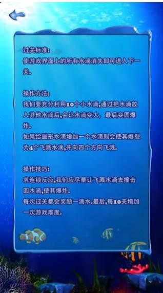 十滴水游戏(tendrops)是一款非常好玩的休闲益智类消除游戏,在这款游戏中,玩家需要点击初始的十个水滴让它变大,从而引发连锁的爆炸反应,完成关卡任务。游戏背景设置在清新唯美的海洋世界之中,带给玩家不一样的游戏视觉体验。游戏的玩法简单有趣,关卡丰富多样,感兴趣的小伙伴们快来下载体验吧。