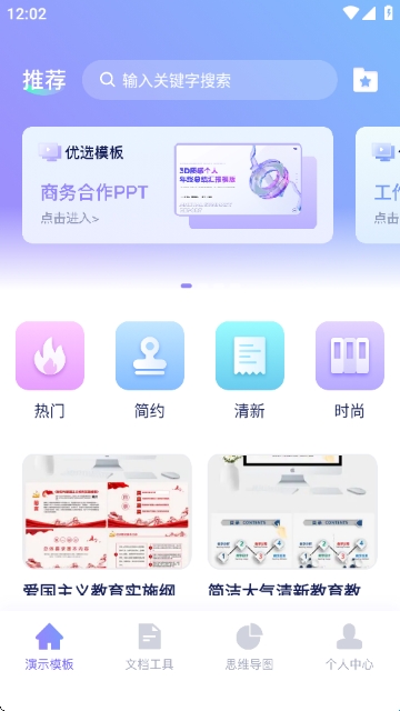 在“演示模板”板块可通过搜索或分类(热门、简约、清新等)查找PPT模板,如商务合作PPT等。