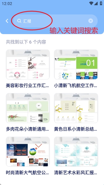 在搜索栏输入关键词(如“汇报”),可快速筛选出相关模板,如美容彩妆行业工作汇报、小清新飞机航空工作汇报等。