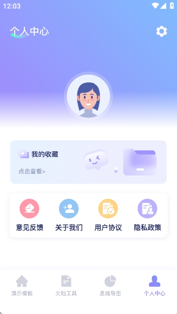 在“个人中心”可查看我的收藏,进行意见反馈、查看用户协议与隐私政策等操作。