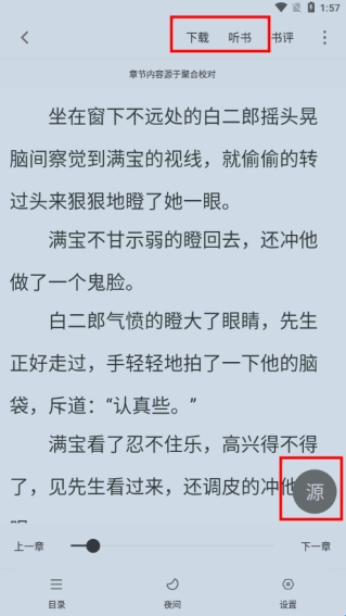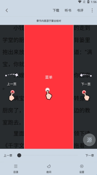 呼出菜单栏可以进行下载离线观看或是听书,切换书源;