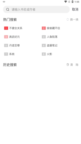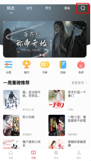进入笔趣阁红色版App书城板块,点击上方的搜索标志就可以开始搜书;