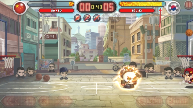 接下来轮到这个游戏里可能是最有趣却也比较麻烦的设计,就是角色们的特技能力。总共有12个来自不同国家/地区的不同角色,他们的特技依照其所属国家/地区而各不相同,比如说美国选手擅长暴力灌篮而日本选手则能够打出分身球等。各种特技需要逐一去探索,还要掌握好它们各自的激发时间,找准时机使出大招才能取得最好的效果,十分考验玩家的操控技术和反应力。