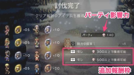4、提升影响力后可以获得升级报酬,影响力等级每提升1级可以获得红宝石和旅行者技能,旅行者技能的获得可以提高角色能力或提高金币获得量。讨伐依赖报酬也会增加,讨伐依赖通关时,除了可以获得队伍影响力之外还可以获得追加报酬,最多可以获得两个。同时提升影响力后可以对话的NPC也会变多,可获得的道具会增加,并且在商店交涉时砍价的成功率也会提升。