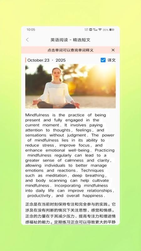 软件提供了线上的专业英语学习,更多场景英语都可学习,精选短文就可随心阅读。