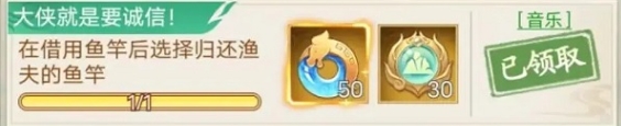 记得有句很有哲理的谚语——“硬币都是有两面的”,你也可以找到这位渔夫,把鱼竿留下自用,这样另一个成就【这鱼竿也没人要啊!】将悄然解锁,50灵玉,30仙游点交到你手上......