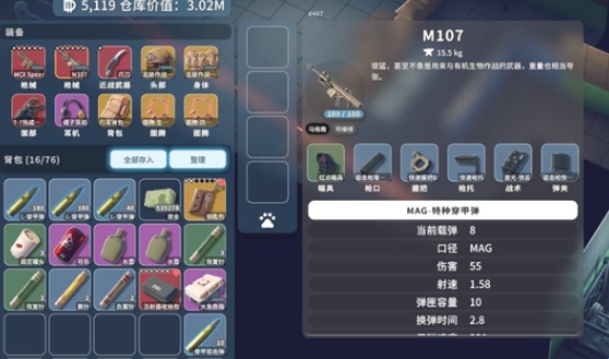 2、M107,子弹同样是穿甲弹,改装不需要太贵,蓝色配件就可以,同样也是伤害高,适合单点boss或者精英怪。缺点是M107比较重,可以先让狗狗背着,需要用的时候再掏出来。