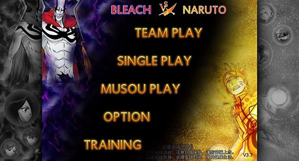 打开死神vs火影,进入选择玩法模式,小队模式TEAM PLAY、单人模式SINGLE PLAY、无双模式MUSOU PLAY。