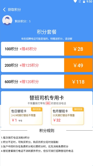 4、替班套餐拨打电话不消耗额外积分,但仅可拨打招聘替班的电话。