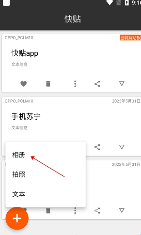 1、用户在手机上的快贴App中点击【+】图标,在弹出的下拉选项中点击【相片】或者【拍、照】