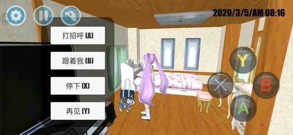 2、人物游戏内长相与编辑时有些许不同。一进入游戏就出现在女主的家。女主的家很少女,家里有一些家具、一只小猫和一个包包,可以跟小猫说话,包包可以带去学校上课。游戏里面和学生以及猫说话的内容有四个选项:打招呼、跟我来、