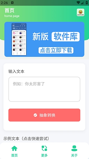 抽象语句生成器是一款专为抽象语言打造的生成工具。软件操作简单,用户可以在这里输入任何你想要转换的语言,然后点击转换即可完成,无需等待点击即用。软件功能全部免费,内置超多实用工具等你探索!感兴趣的小伙伴快来下载体验吧!