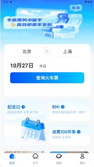 在app首页,带来了查询火车票功能,还有纪念日、bmi计算服务。