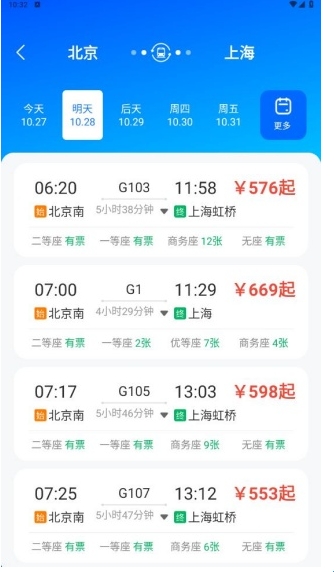 3、高铁票价一键同步,无需逐网对比,省时省力,出行决策更果断。