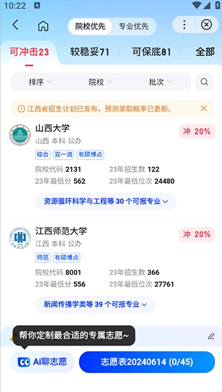 然后软件就可以为大家推荐合适的院校了,并且还有相关院校的往年招生分数和招生数量等信息供大家分析参考